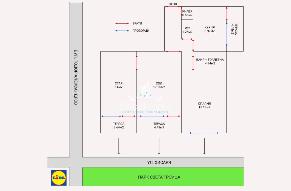 Едно от най-силните предимства на имота е локацията. Блокът се намира точно до парк „Света Троица“, което осигурява приятна гледка и усещане за простор. В същото време районът е изключително комуникативен – метростанция „Константин Величков“ е на около 5 минути, а в близост има и спирки на градски транспорт.